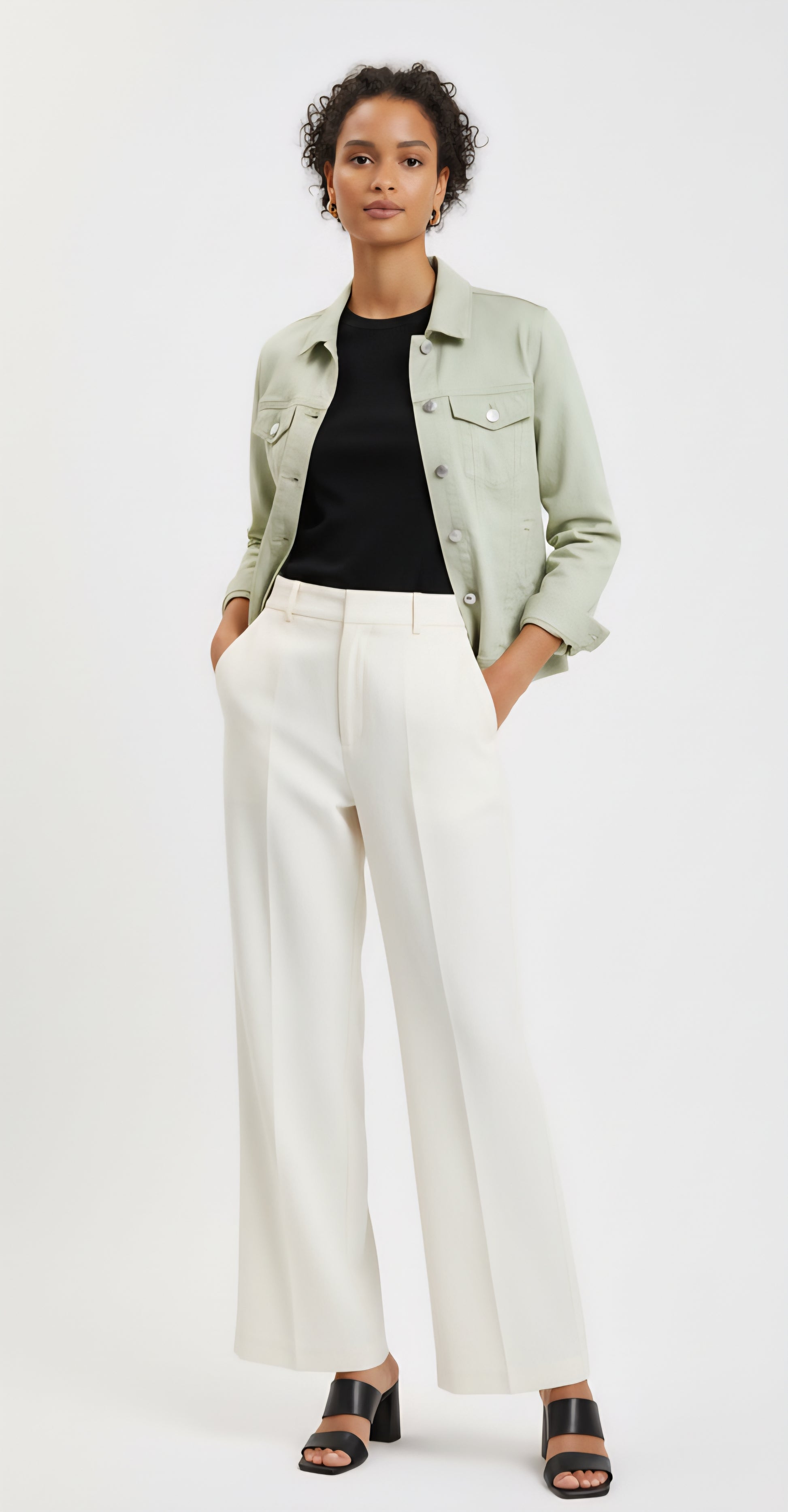 Douce et lumineuse, cette veste en jean vert amande revisite le classique denim avec une touche de fraîcheur et de modernité.
